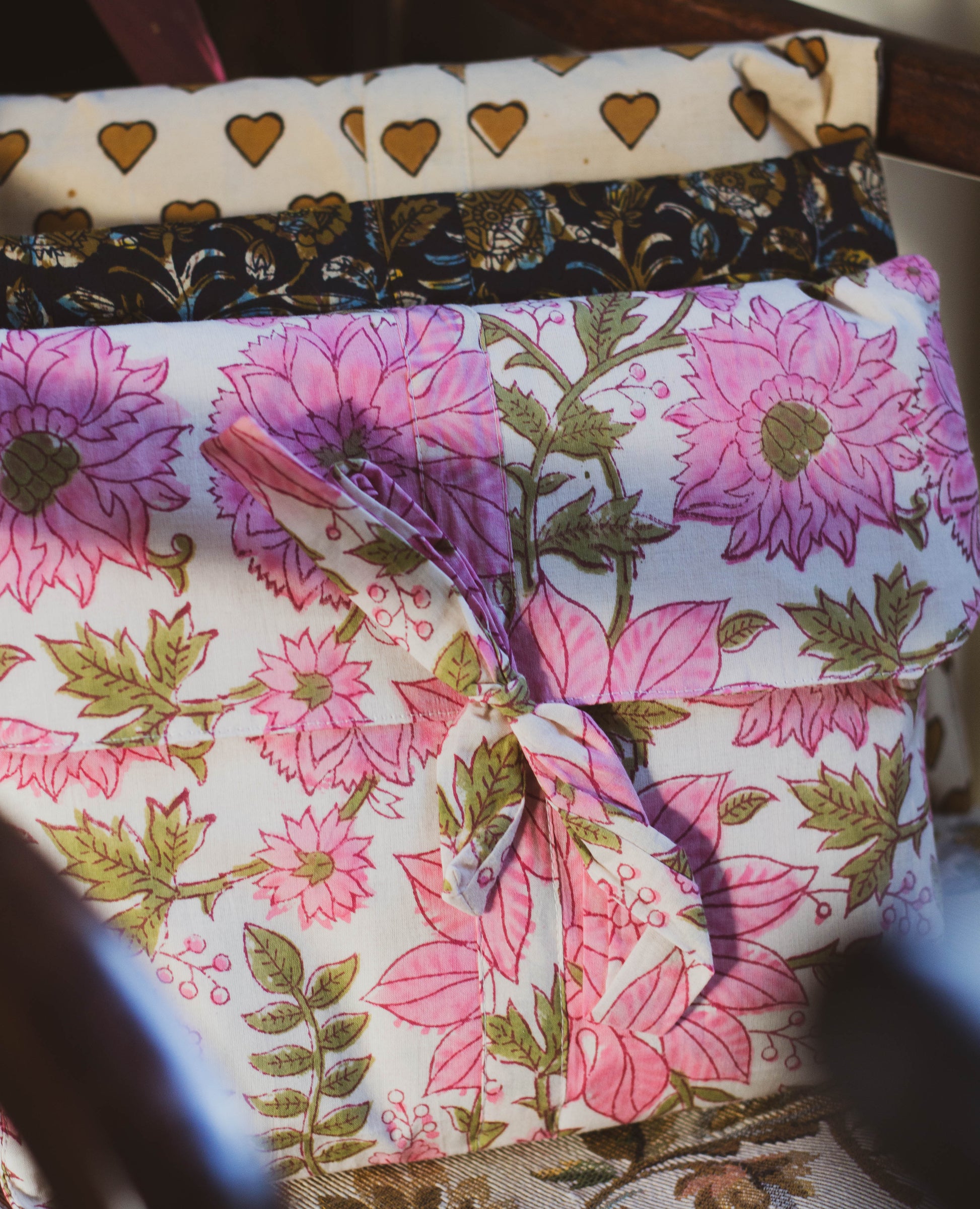 Printed using natural dyes and dried under the warmth of the Indian sun.