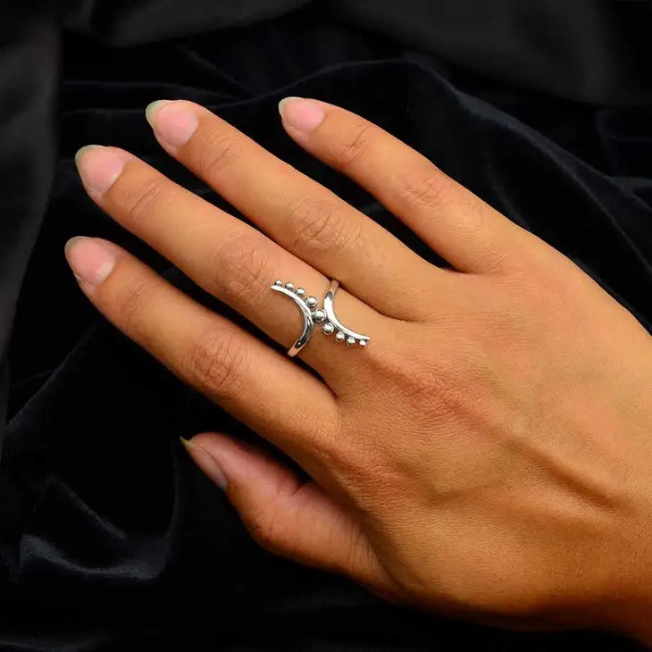 This sterling silver curves and dots ring creates a visual delight when worn. It looks as if the spherical dots are floating atop your finger in the most marvellous way.