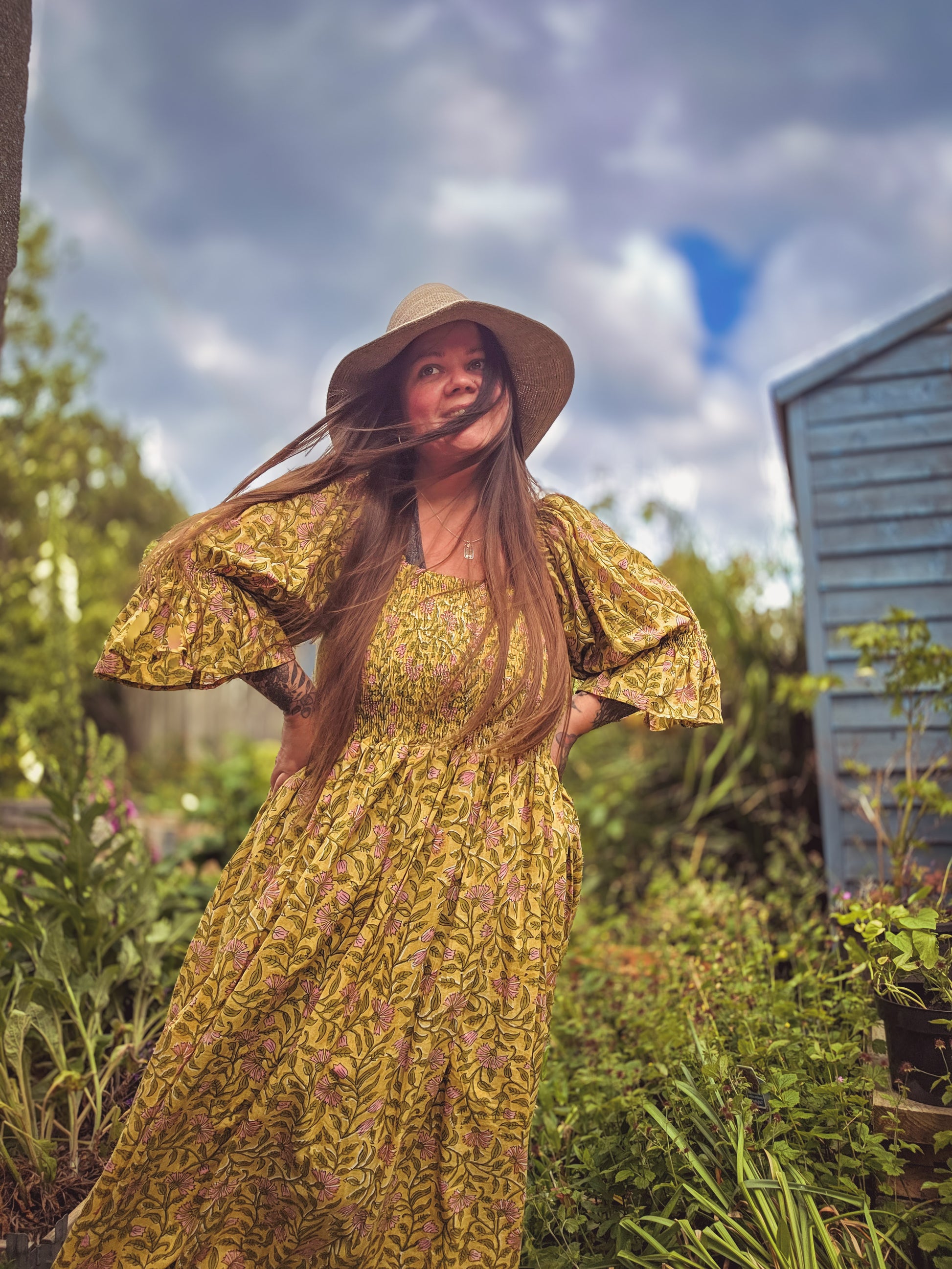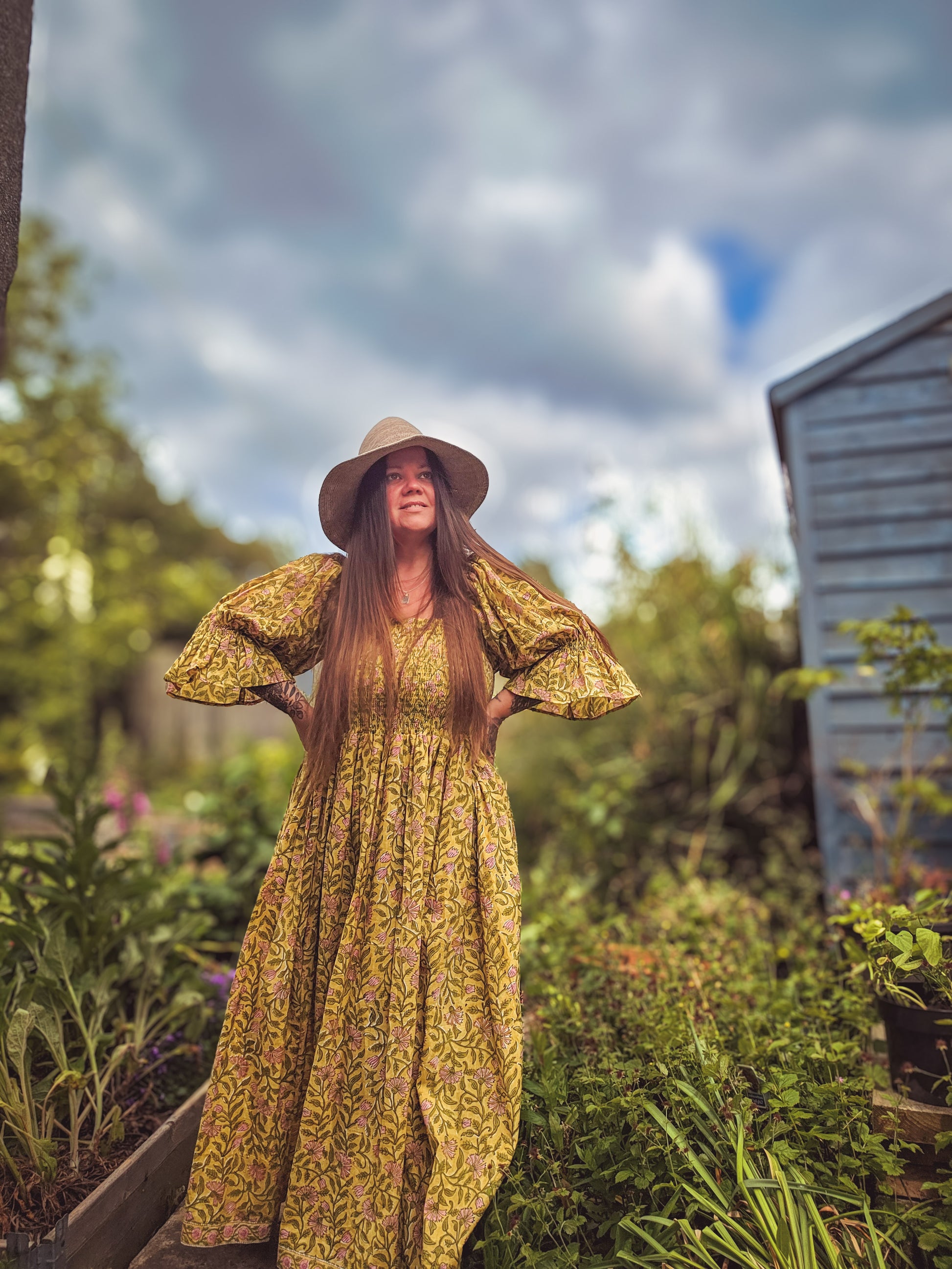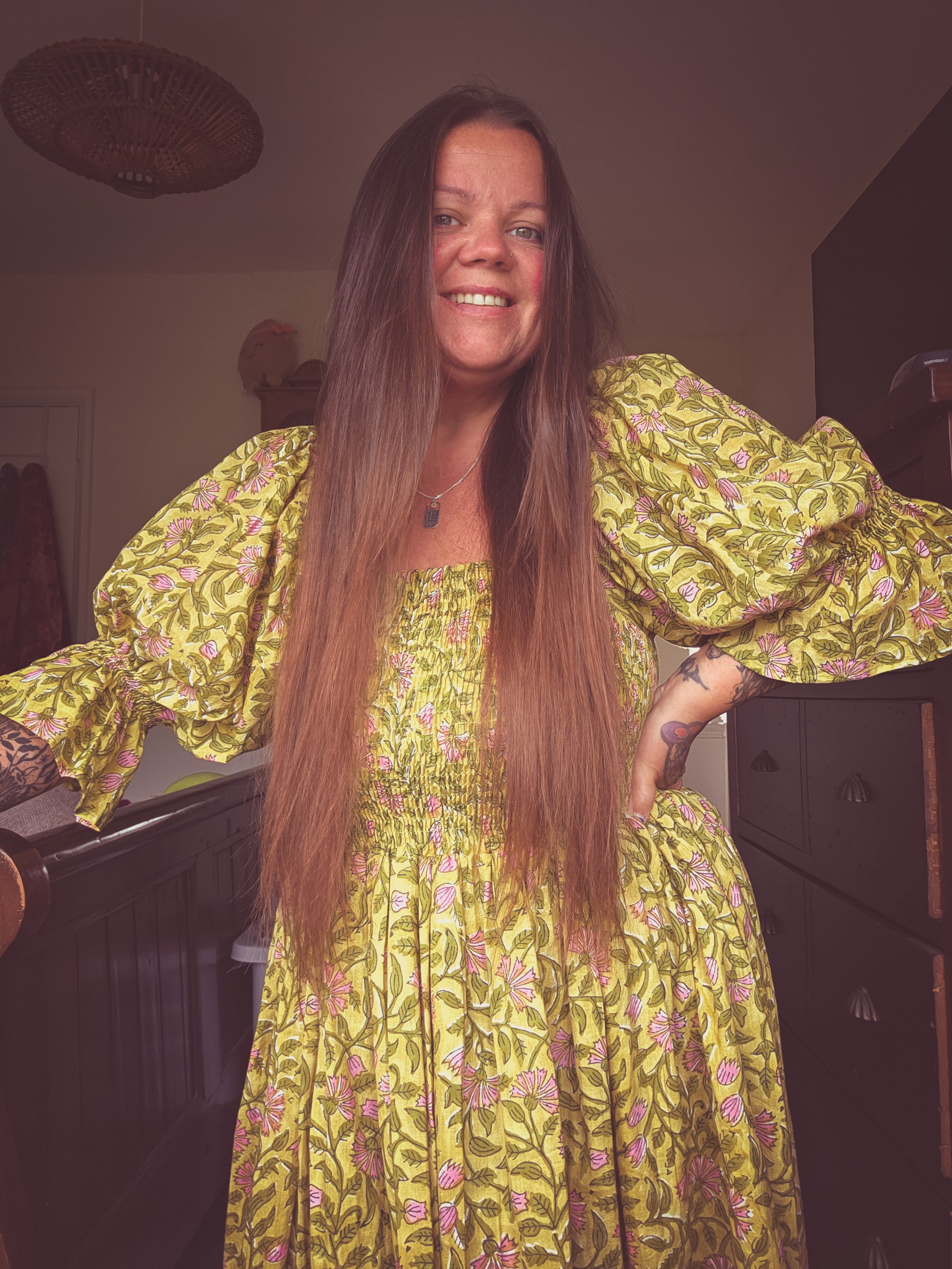 Soft floaty cotton to be worn all year round, she also has pockets :).