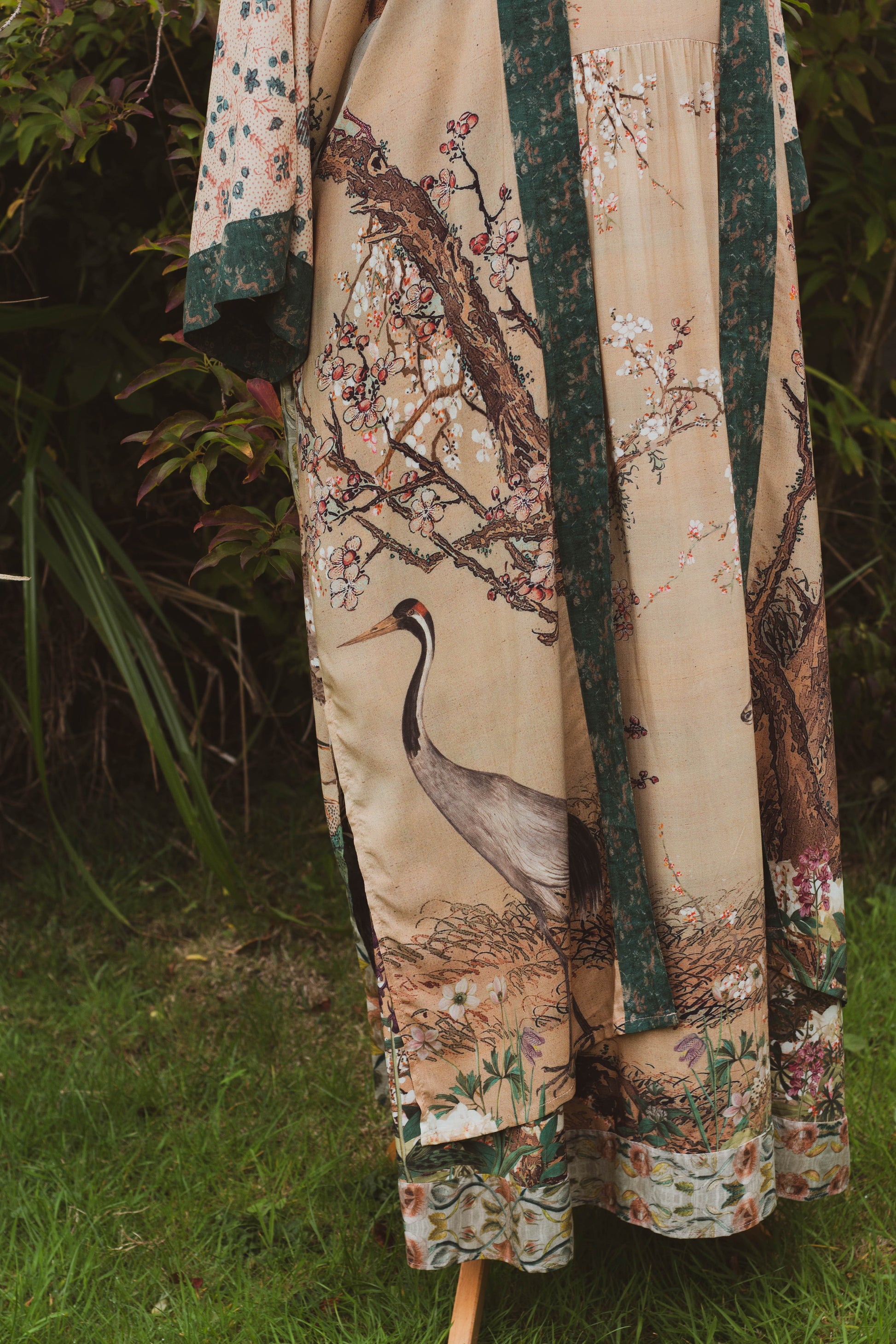 "This captivating print is a blend of the classic and the fanciful (just like all good stories), and was created using artwork spanning more than three centuries. We layered two stunning 18th century ink-on-silk hanging scrolls from Japan painted with wild plum blossoms, peach trees, magpies, and a luminous moon to create this design, then added other whimsical elements — including Flemish antique illustrations of wild deer, birds, and cranes. The printed trim comes from French silk embroidery fragments from the early 1800’s, and the charming pattern on the bodice is a replica of block-printed French paper from the same era. The result is chic, romantic and timeless — and tells a beautiful tale without saying a word ;)"