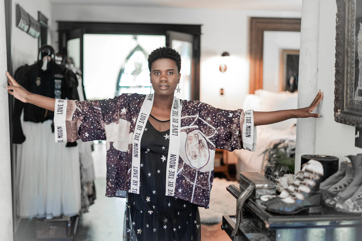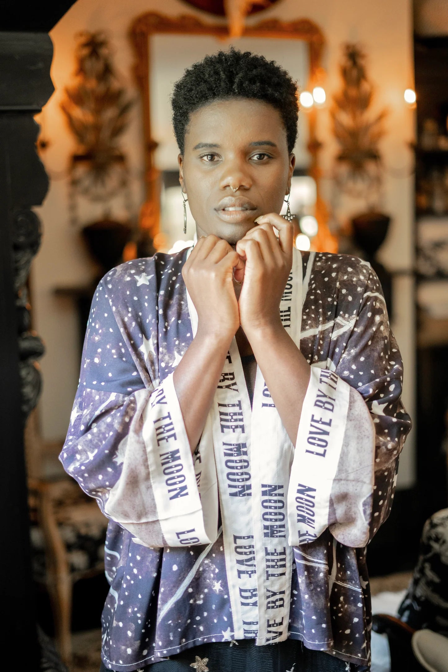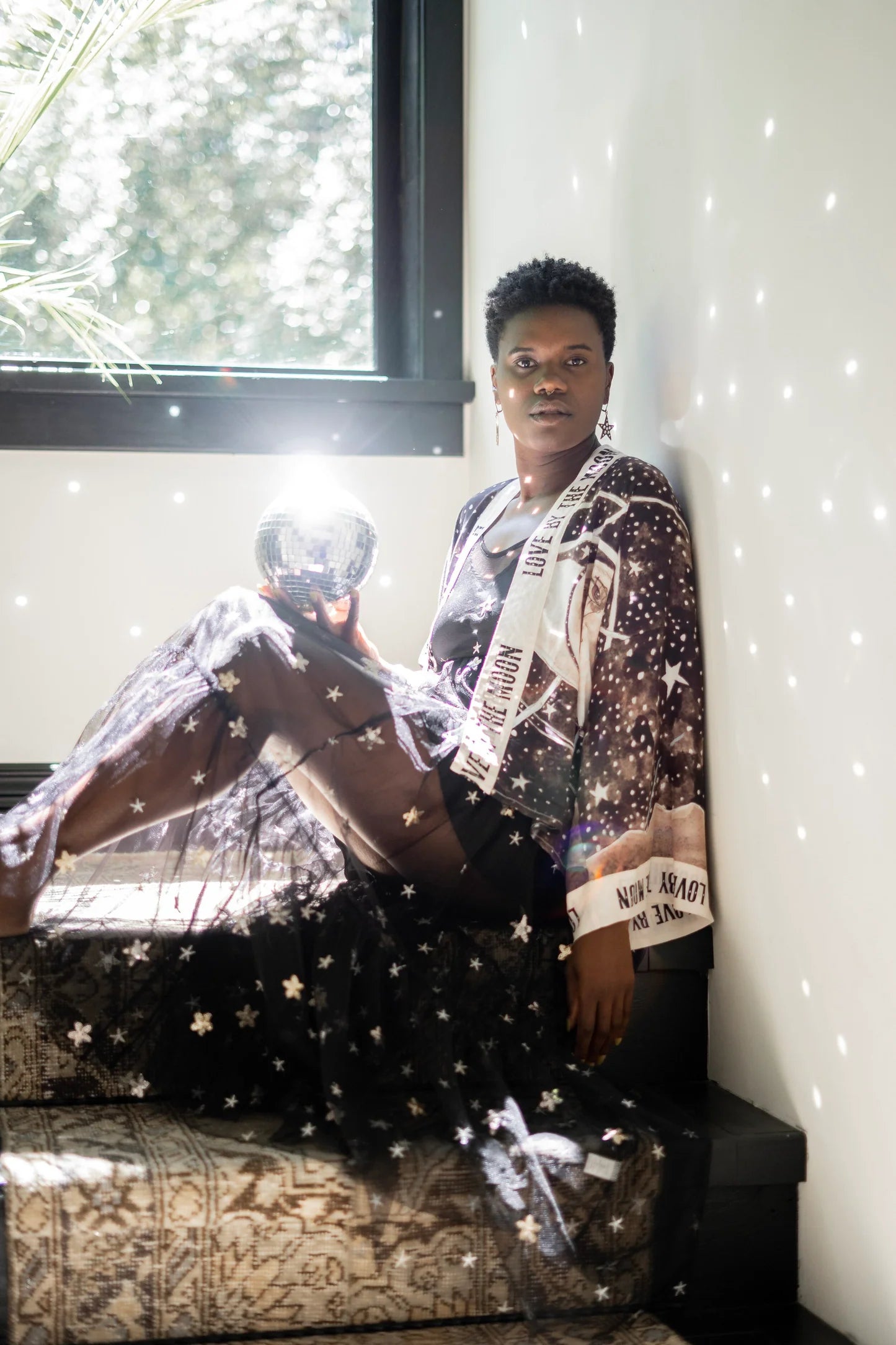 "When we saw the finished painting for our Moonstruck kimono by magical artist Leslie Love, we fell crazy in love with it and knew we had to make more than just one version! Our Love By The Moon design is a playful take on Leslie’s painting, with a sepia colour palette and retro font inspired by early 1900’s film and photography props that used giant paper-maché & cardboard cut-out moons as backdrops for fantastical scenes. This kimono is truly charming — a whimsical, wonderful piece that’s delightfully easy to wear. Go on— love by the moon, and look adorable doing it."