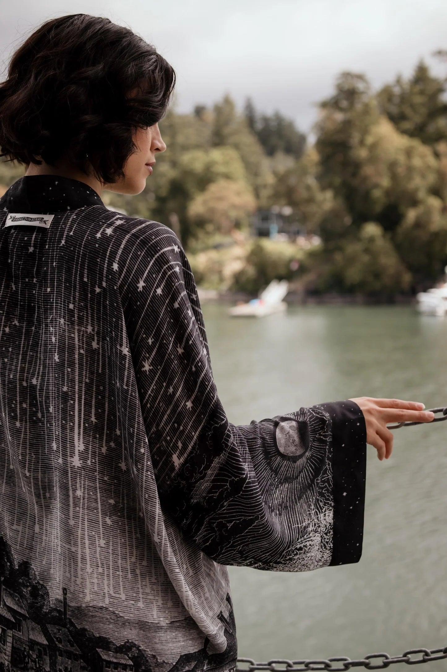 "We are full of wonder and made of stardust and so is this marvellous piece! Created using an 1833 engraving by artist Vollmy, our Stargazer print features a night sky filled with thousands of shooting stars. Vollmy’s work depicts the earliest recorded Leonid Meteor shower, in which more than 240,000 meteors fell from the sky in one night to the amazement and astonishment of onlookers in towns and villages across North America. We like to think that 240,000 wishes were made that night too! The detailed moon on the sleeves comes from astronomy artwork produced at the Camille Flammarion Observatory near Paris in 1899."