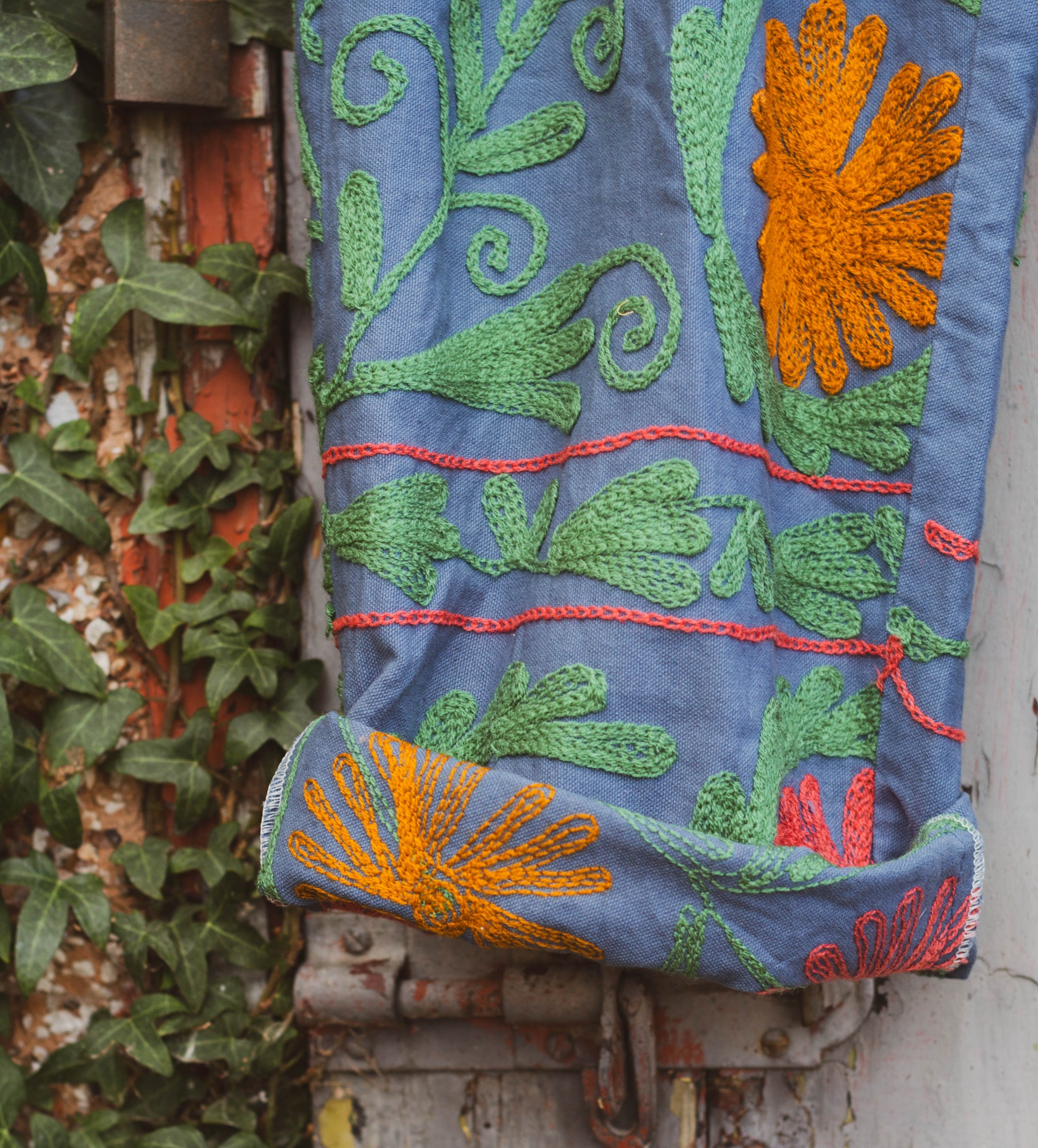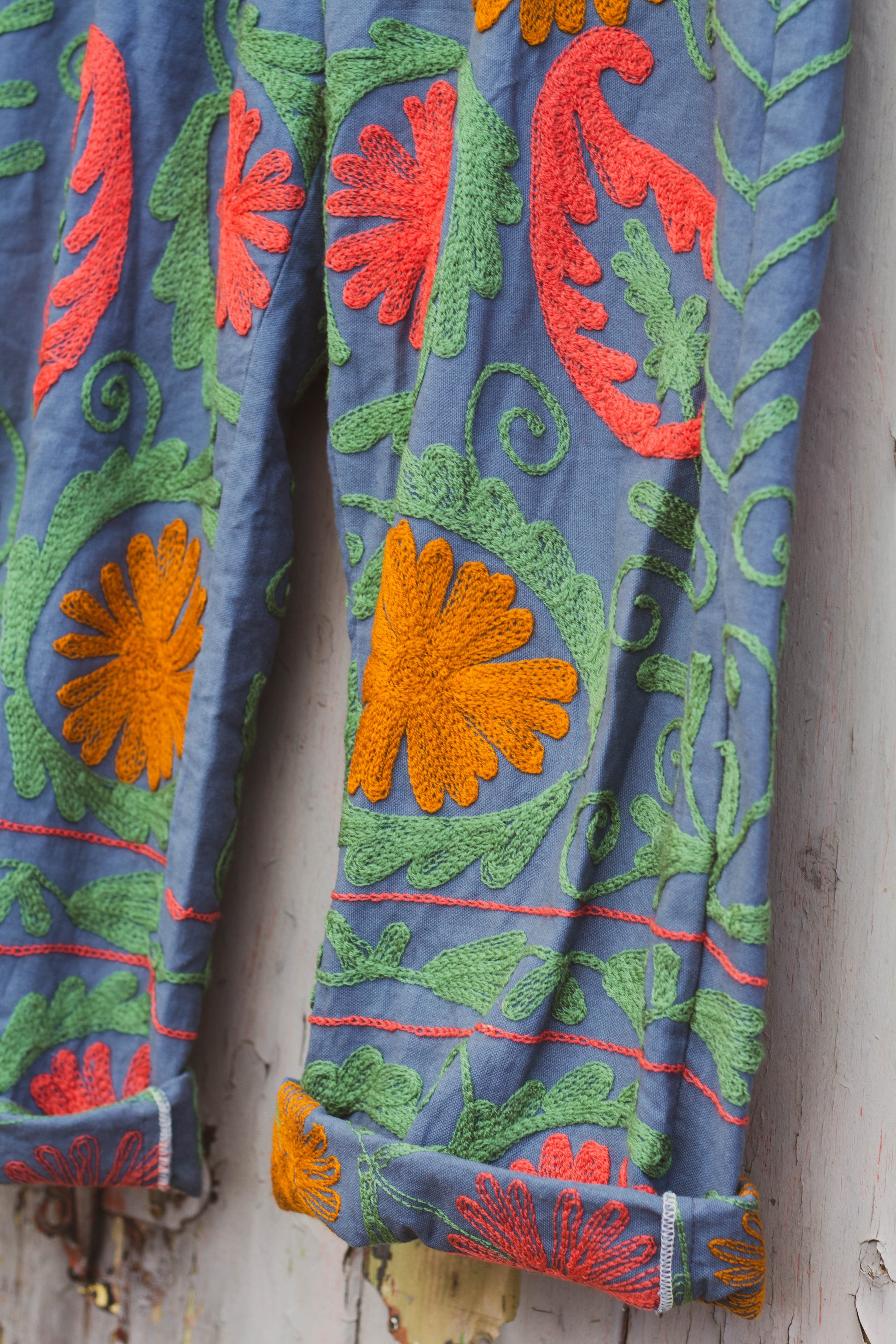 These wonderful trousers have been handmade in Jaipur, they're a little bit of a tester, to see how you feel about the absolute wonder that is Suzani embroidery.