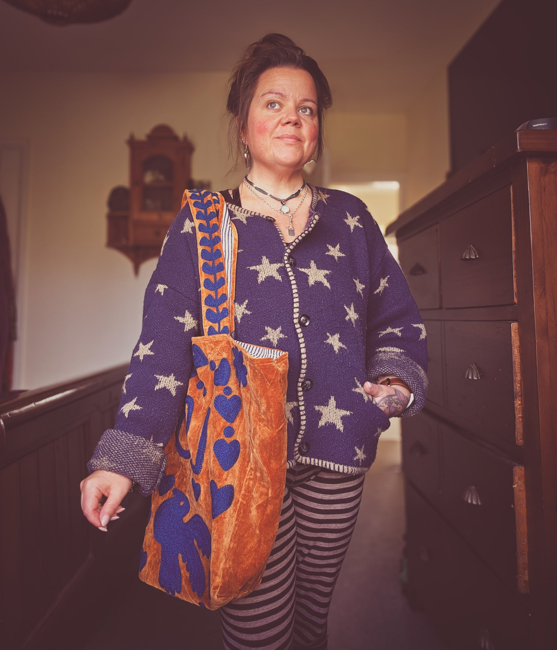 These bags are big enough to hold all your trinkets, they're lined with stripey cotton and have long shoulder handles, perfect.