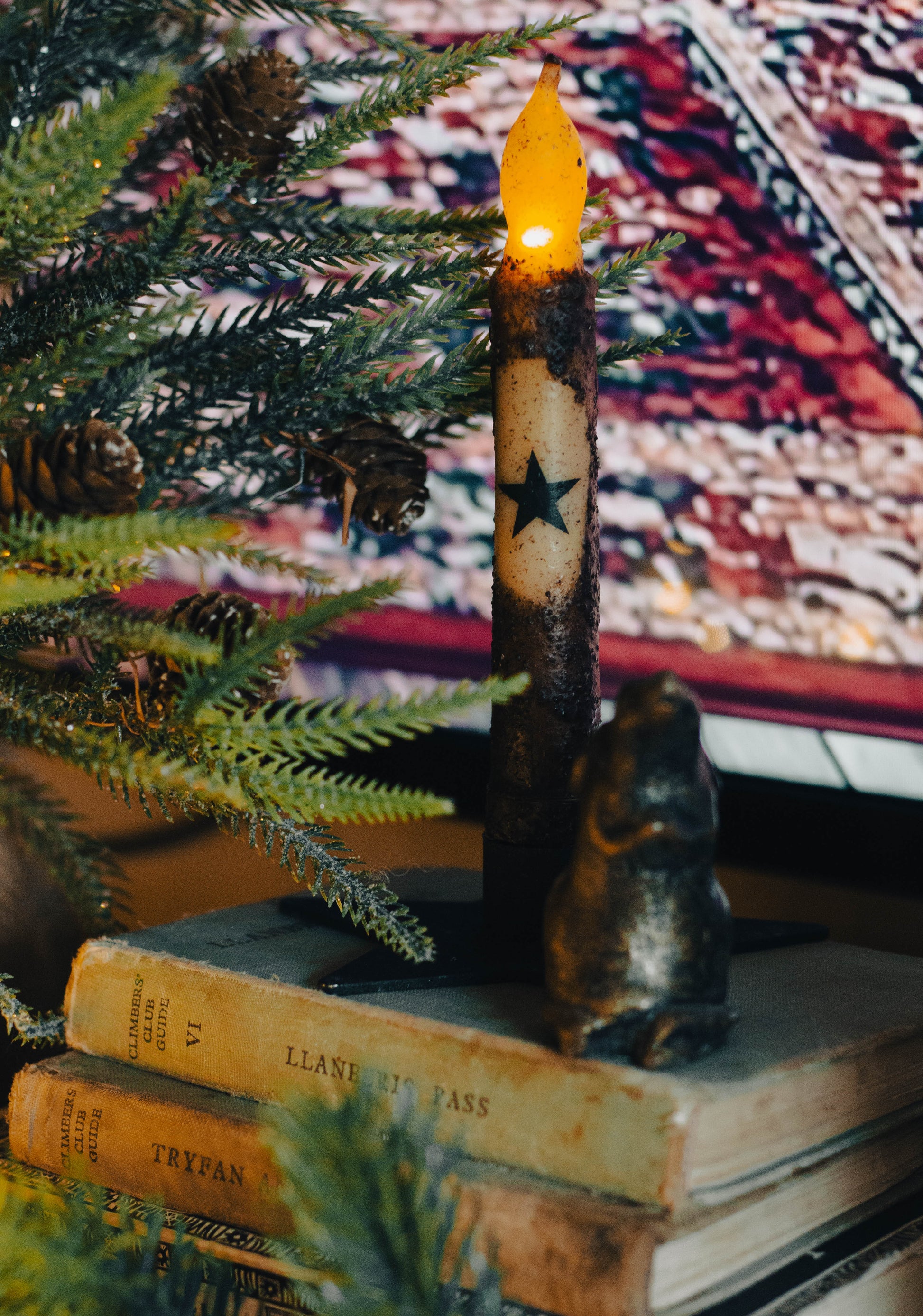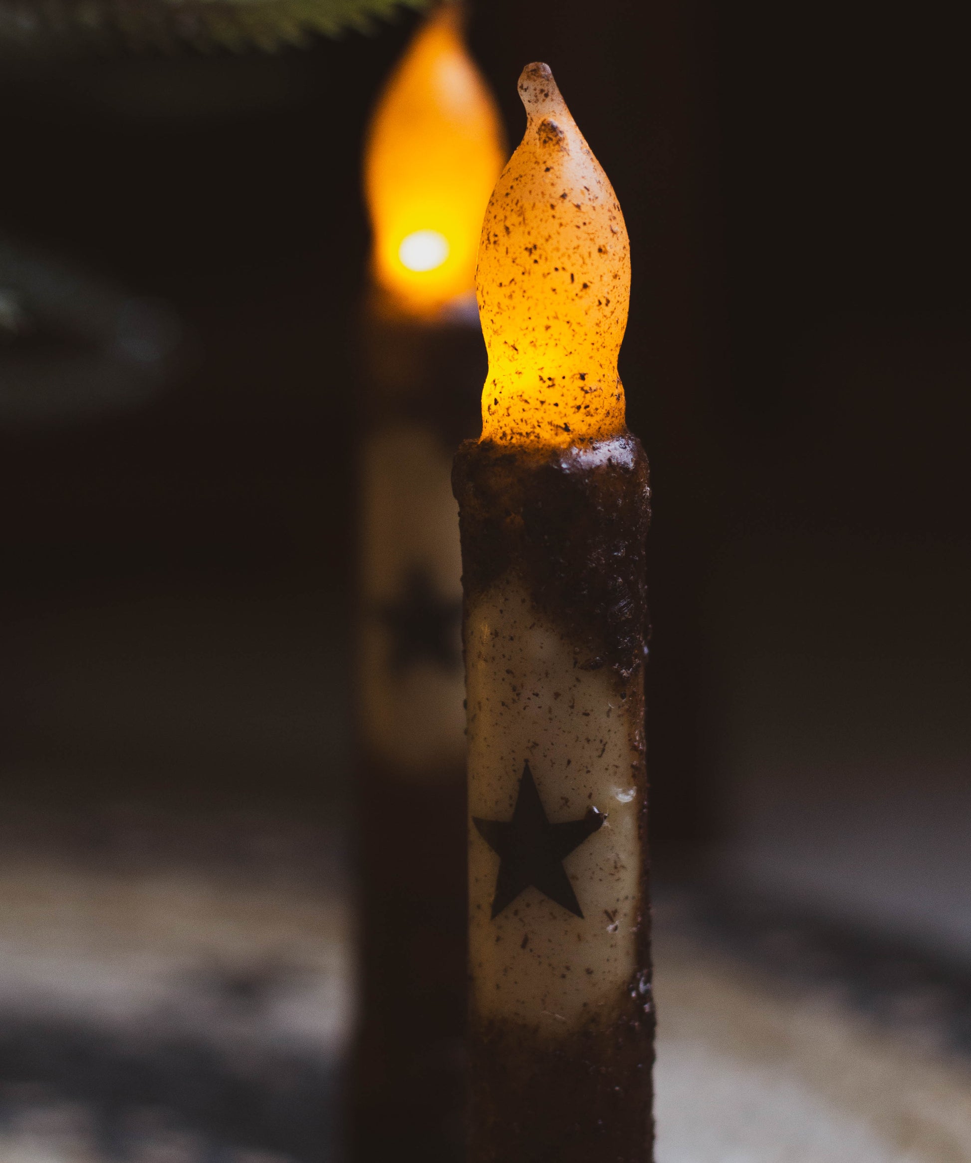 Dipped in spice-brown wax, then rolled in finely ground coffee for a grungy texture. Built-in timer feature keeps candle lit for 6 hours, then switches off for 18. 6" high, and requires two AA batteries (not included).